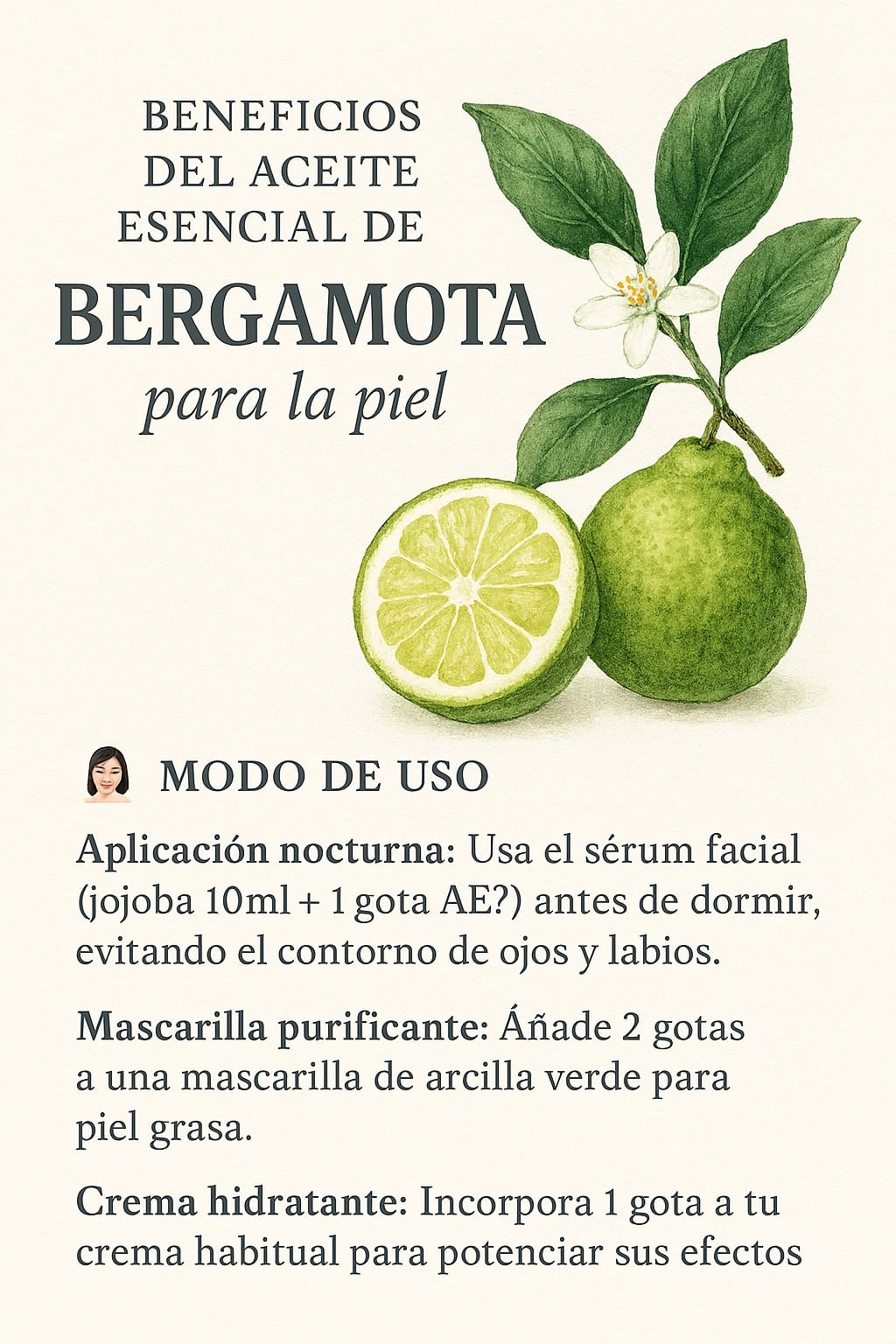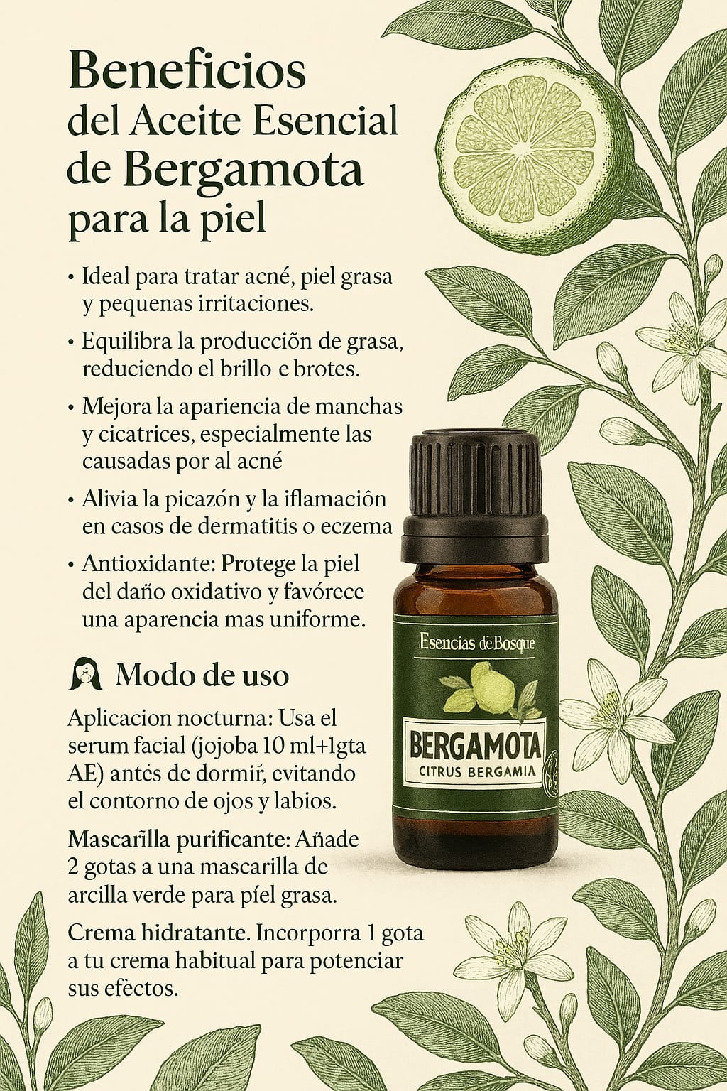 Descubre el poder purificante de nuestro aceite esencial de bergamota artesanal. Reconocido por sus propiedades equilibrantes, es un aliado aromático para pieles grasas o congestionadas, ayudando a promover una apariencia más clara y fresca. Su fragancia cítrica y revitalizante lo convierte en un complemento ideal para tu rutina de cuidado de la piel, contribuyendo a una sensación de bienestar general.